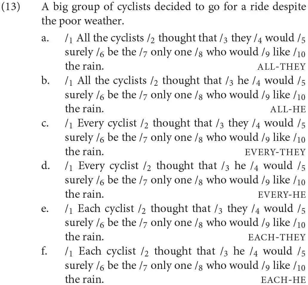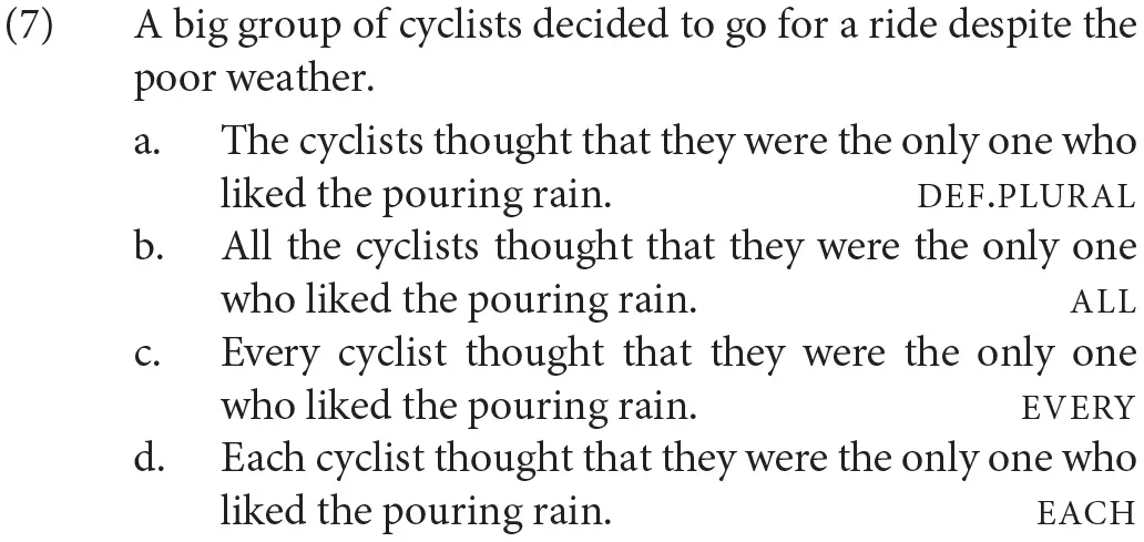 Experiment 1 involved a sentence acceptability judgment task with a total of 80 items: 24 test items and 56 fillers. The 24 test item sets were constructed with a single factor, Antecedent, with four levels depending on the form of the antecedent noun phrase: def.plural (plural definite descriptions); and three types of quantified phrases: all with a plural noun and every and each with singular nouns. Each item consisted of a context sentence and a target sentence. The context sentence introduced an indefinite group described using a non-gendered common noun (e.g., a big group of cyclists). Non-gendered common nouns (e.g., cyclist) readily license singular they (Doherty and Conklin, 2017). The target sentence reiterated the non-gendered noun in a plural definite description (the, def.plural) or a quantified phrase (all, every, each). A sample test item set is given in (7). To force a singular interpretation for they, we predicated it of the expression be the only one in the embedded clause. (Note the infelicity of #The cyclists are the only one who like the pouring rain).
