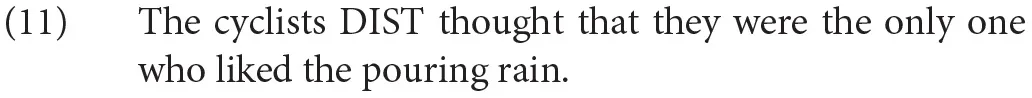The definite plural condition, while rated lower than all other conditions, was nonetheless relatively acceptable, particularly compared to the unnatural fillers. We speculate that definite plural phrases can be construed distributively, perhaps via a silent distributive operator (DIST) that is proposed extensively in the semantics literature (Roberts, 1987; Rullmann, 2003, among others), as in (11).