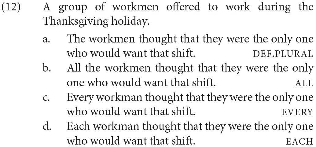 In light of these considerations, one goal of our studies was to investigate the role of distributivity in the availability of bound singular they. To do so, we additionally tested quantified phrases headed by each, which shows very strong tendencies toward distributivity (Vendler, 1967; Ioup, 1975; Tunstall, 1998).3 We reason that if distributivity makes singular bound variable they more available, we should find a cline in acceptability that mirrors the cline in distributivity from all to every to each. That is, in terms of acceptability judgments, we predict that singularly-interpreted they bound by each will be rated as more acceptable than that bound by every, which will be in turn rated as more acceptable than singular they bound by all. On the other hand, if congruence in superficial morphological number alone regulates the acceptability of bound variable they, then we predict sentences where all binds singularly-interpreted they will be rated higher than those involving each and every.