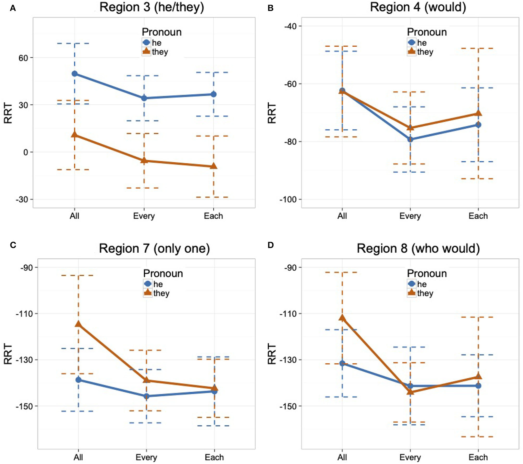 As for predictions concerning the incremental processing of sentences involving bound they under these different quantifiers, we contrast the predictions of the view that, for at least some speakers, they initially seeks plural antecedents and resists singular ones (Sanford and Filik, 2007; Chen et al., 2021; Van Handel et al., 2021) with those of an underspecification approach. Under the former view, we expect to find longer reading times for the pronoun when only a singular antecedent is available. (We use morphologically singular pronouns like he to test for a baseline reading time penalty for pronouns that can find only a number mismatched plural antecedent.) On the other hand, under the underspecification account, if at the earliest moments of processing, they is underspecified for number as suggested by Moxey et al. (2004) and Sanford et al. (2008), we do not expect any disruption in reading times at the pronoun in sentences where it can only find an antecedent headed by singular every/each in comparison to plural all. Under either account, however, if distributivity is a factor in incremental processing, then we expect some processing penalty for all in comparison to every/each.