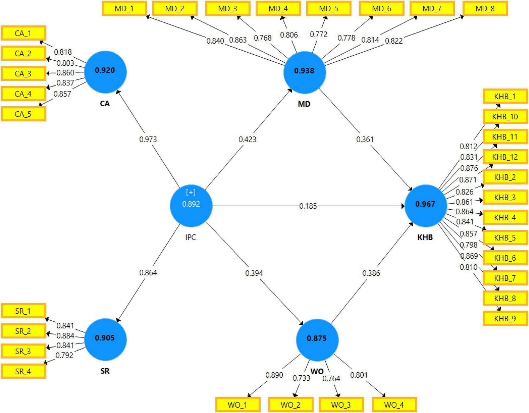 Table 2 shows that the average variance extracted (AVE), which reflects the overall variance in the indicators accounted for by the latent construct, was 0.698, 0.706, 0.654, 0.639, and 0.711 for competitive anxiety (CA), sense of rivalry (SR), MD, WO, and KHB, respectively. All values were above the cutoff 0.5 as suggested by Nunnally (1994).