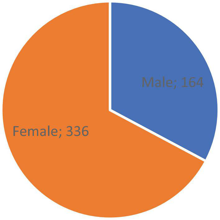 The first question was dedicated to the gender of the respondents. In the survey, 500 respondents were attended, of which 164 were men and 336 were women; see Figure 1.