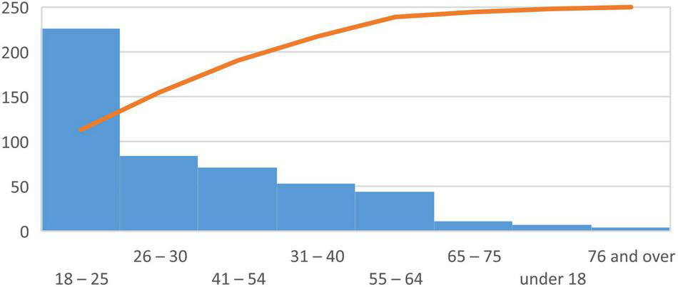226 respondents were between 18 and 25 years old, 84 respondents were between 26 and 30 years old, 71 respondents were between 41 and 54 years old, and only 4 respondents were 76 years old and more; see Figure 2.