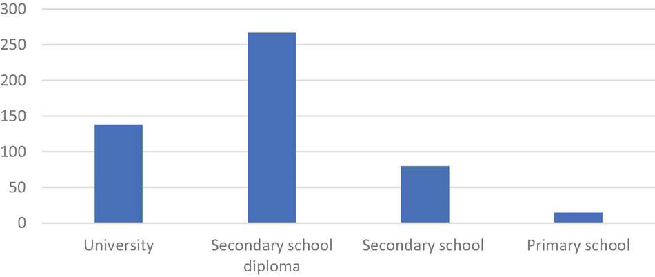Another demographic question in this survey was about education. Of 500 respondents, 267 respondents had secondary school diploma, only secondary school had 80 respondents, and 138 respondents on the other hand, had university education; see Figure 3 below.