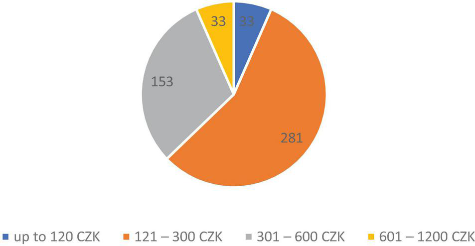 The survey also included a question that looked at the average amount per person spent by respondents during a visit to a restaurant. 281 respondents spent on average 121 – 300 CZK during one visit to a restaurant, 153 respondents 301 – 600 CZK, and only 33 respondents spent up to 120 CZK and also 601 – 1200 CZK; see Figure 4 below.