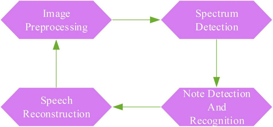 The generation of digital musical scores mainly relies on manual input, which not only requires high professional music knowledge of the staff but also requires them to be very familiar with specific music software. Therefore, it is necessary to efficiently and accurately convert musical score visual information into digital information, making the development and optimization of musical score recognition technology an indispensable link in the research background. The MOR system based on AI is presented in this paper. This system is an auxiliary tool for ballad creation, which is convenient for sampling and categorizing musical scores. It can extract musical score data in a unified format and provide guarantees for later development and optimization. The objects of musical score recognition are mainly paper musical scores and digital image musical scores. At present, the main implementation method is to convert digital images through various hardware optical scanning devices to generate binary images. Then, the binary image is further processed. The paper music score is transformed into digital data information through algorithms such as the deletion of staff lines and the positioning of notes. Figure 4 demonstrates the workflow of the OMR system.