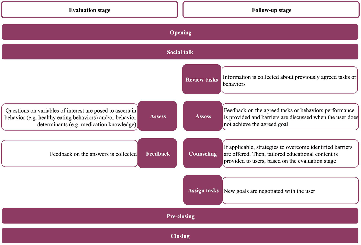 Each daily interaction was structured in sequential steps based on the literature (Bickmore et al., 2005). In the evaluation stage, the sequential steps are depicted in Figure 1 (opening, social talk, assess, feedback, pre-closing and closing). The “opening” and “social talk” steps involve greeting the user and inquiries about the general emotional and physical state, respectively. Finally, the content of the next interaction is described in the “pre-closing” step and a farewell is delivered (“closing”). The dialogue in the follow-up stage has three additional steps, “review tasks,” “counseling,” and “assign tasks,” also described in Figure 1.