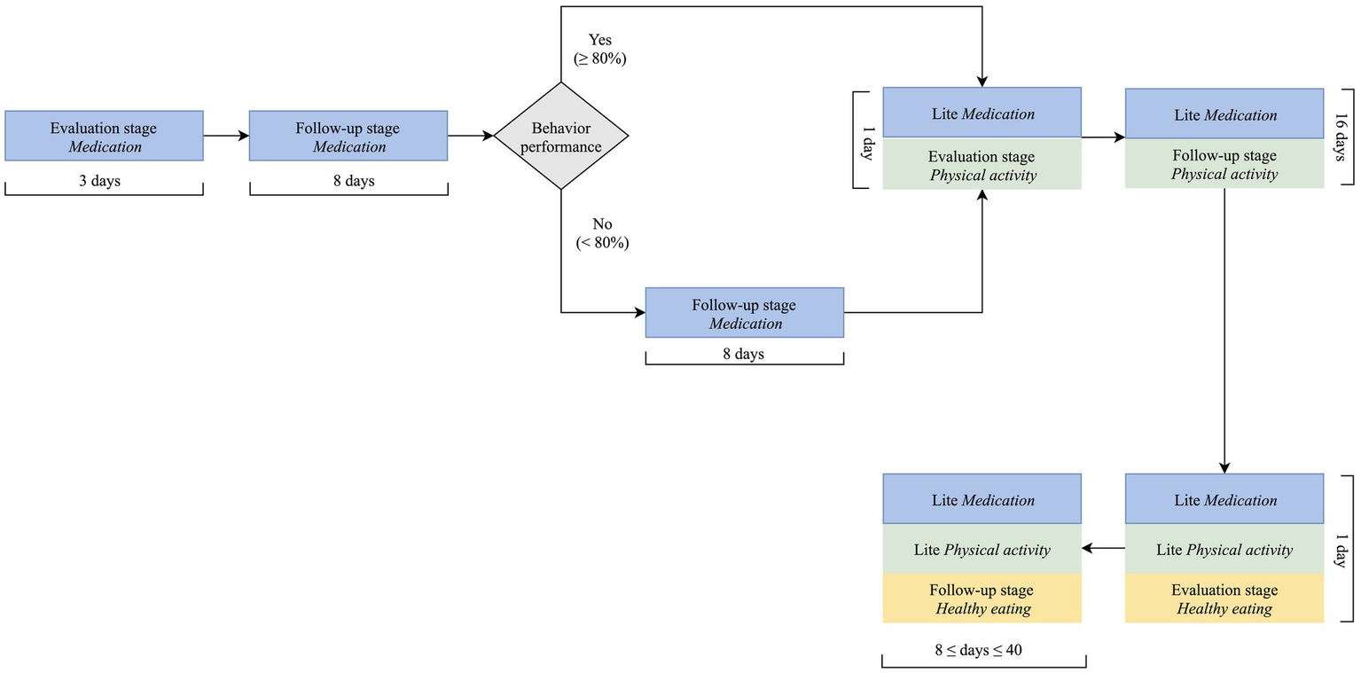 A critical design decision was how to combine the physical activity component with the remaining components of the intervention: medication taking and healthy eating. There is little guidance on the best approach to design digital multi-behavior interventions; general recommendations indicate that interventions targeting behaviors requiring inaction (such as not eating high fat food) and those requiring action (such as increasing physical activity or taking medication) should not be pursued concomitantly (Albarracín et al., 2018). From a practical standpoint, pursuing three behaviors at the same time from the outset of the intervention would increase the length of each interaction to a point that was deemed detrimental for engagement. Taken together, these two aspects determined a stepwise approach, in which medication taking is firstly addressed, then the physical activity component added, while reducing the intensity of the medication taking component; as depicted in Figure 2, the same approach was employed for the healthy eating component. A less intensive intervention in each component, designated as “lite” (Figure 2), comes up after firstly, addressing each target behavior more intensively. “Lite” interventions have reduced number of dialogue steps and provide feedback to users based on weekly data (e.g., average medication taken in the last week). They encompass repeated collection of evaluation data, such as on medication knowledge and healthy eating behaviors, to enable intervention tailoring in the long term.