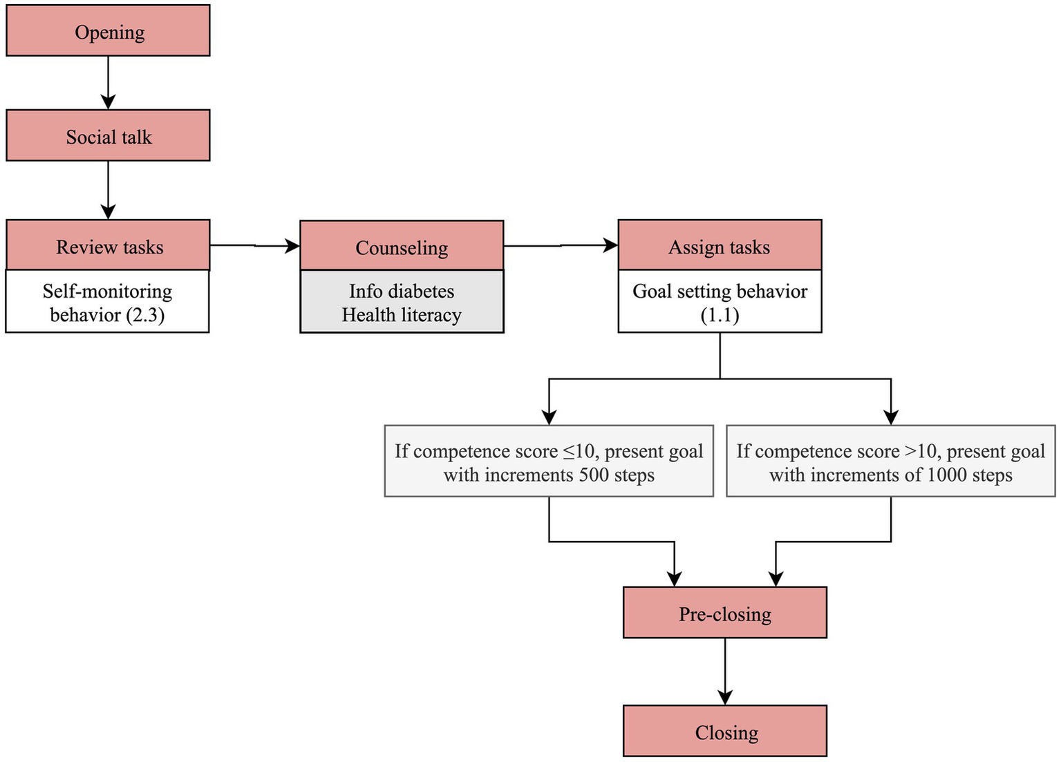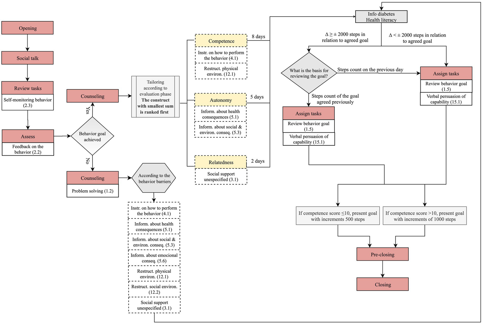 Thirteen BCTs were implemented in the prototype via the ACA (e.g., goal setting behavior 1.1). Six if-then rules were derived and depicted in the dialogue steps through process flow diagrams, which map how the system functions. An example of a rule is “If competence score ≤ 10 then, apply BCT 1.1 with 500 steps increments as options for the daily walking goal; If competence score > 10 then, apply BCT 1.1 with 1,000 steps increments as options for the daily walking goal.”