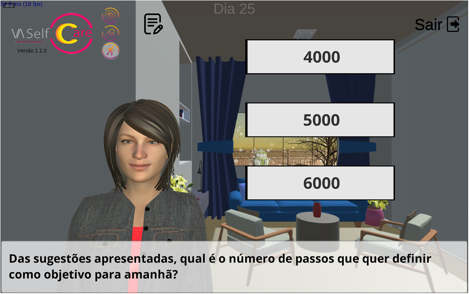 The anthropomorphic conversational agent, Vitoria, developed within the VASelfCare project, was designed to support behavior change through daily interactions with users. Based on the literature (e.g., Bickmore et al., 2010), users are offered the possibility of interacting with Vitoria once a day only. Vitória is capable of speaking European Portuguese and expressing emotions through facial and body animations; verbal content is supplemented with subtitles to help reduce potential communication barriers such as hearing deficits. User’s input consists of a set of options depicted in response buttons or through values recorded. For details on the IT development of the anthropomorphic conversational agent prototype refer to Balsa et al. (2020) and Guerreiro et al. (2020).