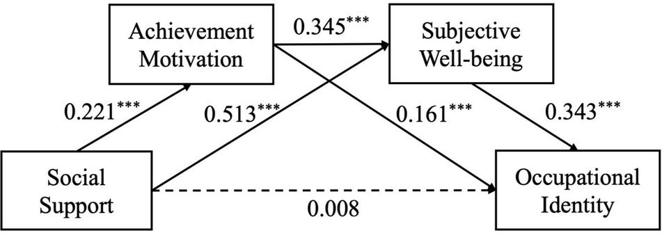 The results showed that the total effect of social support on occupational identity was significant (β = 0.246, p < 0.001), supporting H1. After including the mediating variables, social support not only significantly positively predicted the achievement motivation of pre-school “to-be teachers” (β = 0.221, p < 0.001), but also significantly and positively predicted the subjective wellbeing of pre-school “to-be teachers” (β = 0.513, p < 0.001). However, the direct effect of social support on occupational identity was not significant (β = 0.008, p = 0.860). Achievement motivation can not only significantly and positively predict the subjective wellbeing of pre-school “to-be teachers” (β = 0.345, p < 0.001), but also can significantly positively predict the occupational identity of pre-school “to-be teachers” (β = 0.161, p < 0.001). Besides, Subjective wellbeing can significantly and positively predict the occupational identity of pre-school “to-be teachers” (β = 0.343, p < 0.001) (Shown in Table 2).