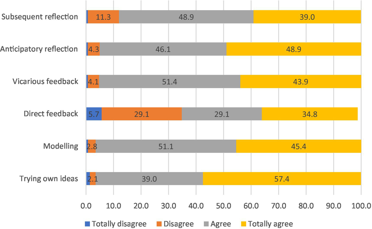 | Trying own ideas | Model learning | Direct feedback | Vicarious feedback | Subsequent reflection | Anticipatory reflection | |