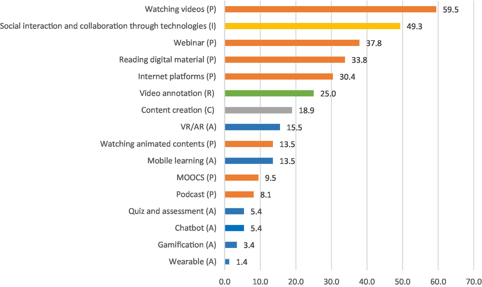 The many opportunities for learning informally in the workplace have been increased by the ubiquitous nature of digital technology (Brown and Mbati, 2015) by making the boundaries between informal and formal learning even more blurred and crossable (Littlejohn and Margaryan, 2014; Egloffstein and Ifenthaler, 2017; Ang et al., 2018; Clark et al., 2018). Emerging opportunities for digital learning include game-based learning, simulations, massive/corporate open online courses (MOOC, cMOOC), social networks, learning analytics, and mobile and augmented applications (Ifenthaler, 2018). According to Wong and Looi (2011), mobile devices create ‘seamless learning spaces’, providing continuity to the learning experience across learning venues and between individual and social learning. The widespread adoption of technology in many facets of modern life has created an increasing urgency to recognise the importance of adult informal learning, especially when it happens in a digital environment (Ang et al., 2018). However, there is poor empirical evidence concerning the strategies, more or less deliberate and structured, that people adopt when they learn in the workplace by using digital technologies. Ang et al. (2018) investigated learning behaviours associated with the use of technologies in a dual programme in which learners are working full-time and studying part-time for a tertiary degree. They found similar patterns between school and workplace use of digital technologies, mainly oriented to ‘receiving’ information such as accessing newsfeeds, listening to podcasts, and downloading content from the internet (which corresponds to the passive mode of the ICAP framework). More research is required to understand learners’ strategies in the adoption of digital technologies for informal workplace learning. In the context of this paper, we use the ICAP framework to categorise how companies adopt digital technologies in informal workplace learning when faced with disruptions.