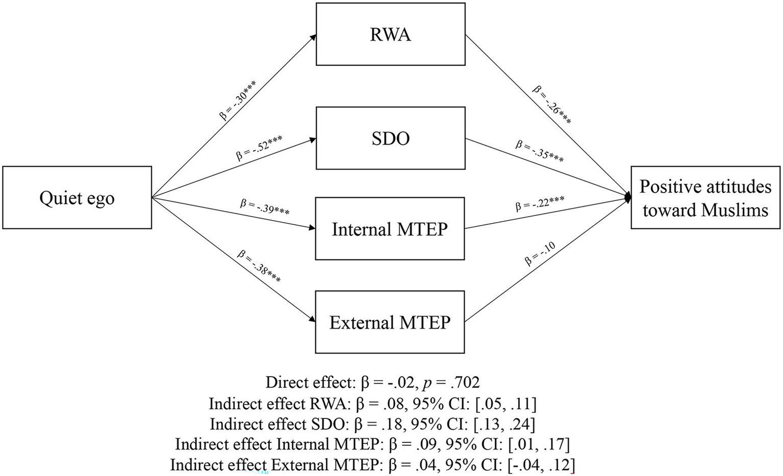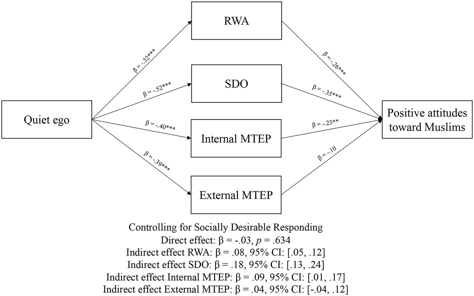In Study 2, we sought to replicate and extend Study 1 findings and tested four potential mechanisms by which quiet ego may be associated with attitudes toward Muslims: RWA, SDO, and internal and external MTEP. We hypothesized that quiet ego would be positively associated with positive attitudes toward Muslims, conceptually replicating results from Study 1 using a more nuanced multi-item measure of attitudes toward Muslims and controlling for socially desirable responding. Additionally, we hypothesized quiet ego would be negatively associated with RWA, SDO, and internal and external MTEP. Finally, we predicted that the association between quiet ego and positive attitudes toward Muslims would be explained by four ideological and motivational variables associated with outgroup attitudes, namely RWA, SDO, and internal and external MTEP.