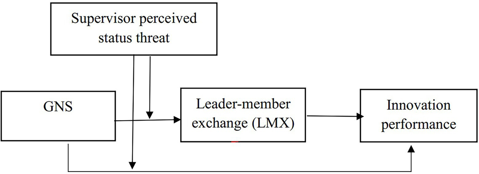 However, some contradictory phenomena cannot be explained by the leader–employee cooperation perspective. For example, a leader sometimes expresses very weak support toward subordinates with high GNS who can help him achieve team goals, and even destroy or suppress innovative behavior of subordinates with high GNS. However, the existing literature rarely discusses the phenomenon. We argue that supervisor perceived status threat can explain leaders’ “suppression” behavior possibly. As the spokesperson of the organization, a leader wants to lead team members to achieve team goals and realize personal goals. Furthermore, as rational egoists, leader’s personal goals usually are superior to team goals (Hoyos, 2013). Among the numerous personal goals of leaders, status demand is the deepest and most fundamental demand. Neuroeconomics and ecology show that people’s demand for status is overwhelming (Charness et al., 2014; Liu et al., 2015). Therefore, there is also a dynamic co-opetition relationship between leader and member from the perspective of status competition. On the one hand, leaders need to rely on the employees’ GNS to achieve team tasks (Griffin et al., 2007). On the other hand, leaders face challenges and threats brought by employees with high GNS. According to status characteristics theory (Berger et al., 1972) and social dominance theory (SDT; Sidanius et al., 2004), the leaders regard the individuals with high GNS as potential status competitors with necessary capability to obtain high status and participate in status competition. Due to the scarcity and competitiveness of organizational status resources, leaders naturally tend to protect the existing status. Leaders who perceive status threat probably make a poor response to employees’ GNS, for example, taking non-political measures to destroy the LMX relationship, and hindering the positive effect of employees’ GNS on their innovation performance. Hence, the cooperation perspective cannot effectively explain the leaders’ influence on the relationship between employees’ GNS and their innovation performance. Accordingly, this paper introduces the supervisor perceived status threat as a leadership characteristic variable to explore whether it will exert a contingency effect on the influence of employees’ GNS on LMX and innovation performance.