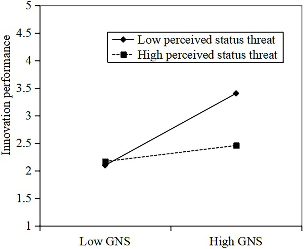 Although the employees with high GNS can bring more innovation performance, the degree of the supervisor perceived status threat probably determines whether he is willing to provide employees with innovation support and resources. A leader with high-status threat perception will intensify his control (Liu et al., 2021) and influence to maintain his status rather than provide resources to promote employees’ innovation performance (Galinsky et al., 2010). Conversely, employees probably fail to be recognized and appreciated by the leaders because of their GNS, but they are ignored and alienated, further weakening innovation performance. Thus, we propose the following hypothesis: