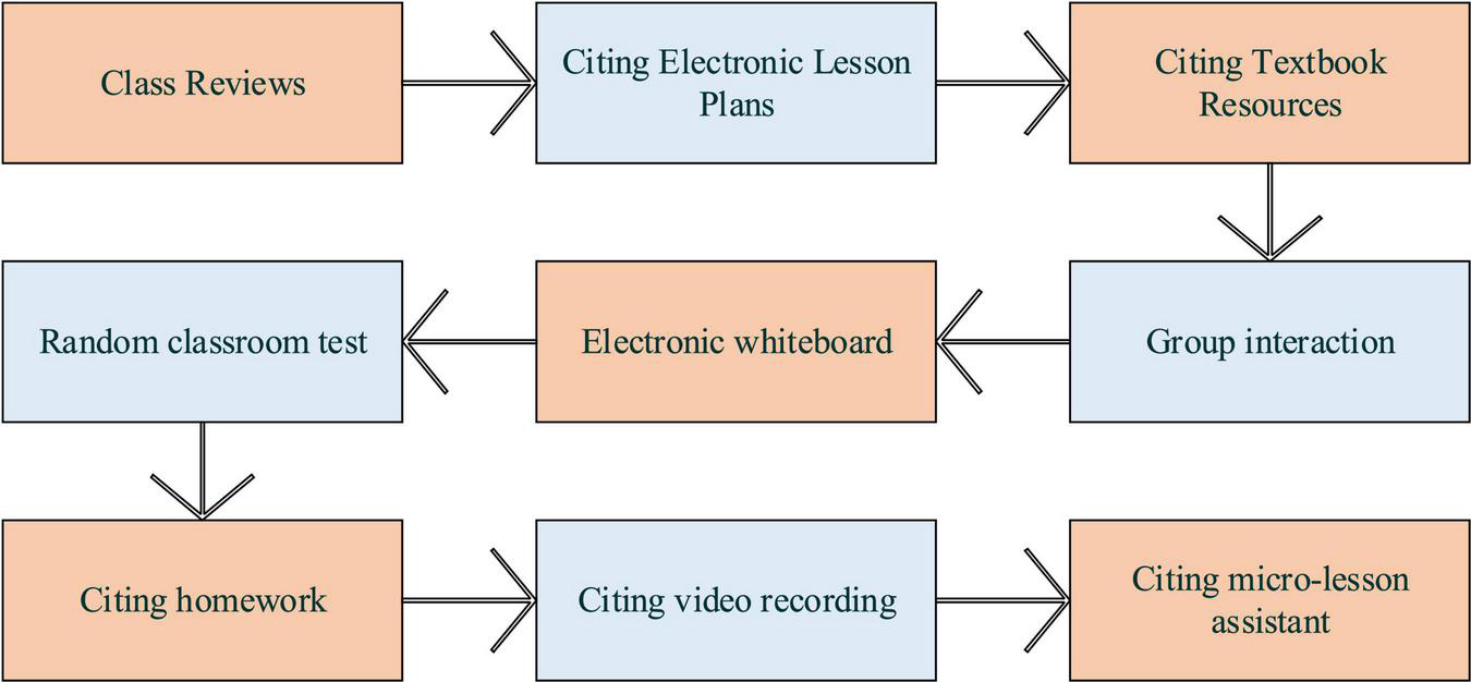 Figure 3 implies that the teacher side of the CAI system includes six processes: class review, citing electronic teaching plans, citing textbook resources, group interaction, electronic whiteboard, citing random classroom tests, citing homework, citing video recording, and citing micro-lesson assistants. Teachers use the class review to comment on students’ academic achievements and stimulate students’ learning. Teachers use electronic lesson plans to prepare lessons and apply them directly in class. The primary purpose of citing textbook resources is to insert textbook resource videos in the classroom. Teachers interact in groups, increase group interaction links, and make online comments in the teaching process. Meanwhile, the electronic whiteboard is used for teachers to write the teaching contents other than the electronic teaching plan. Teachers use random classroom tests to push the pre-written in-class test questions to students. The citing homework is where the teacher pushes the prepared homework to the students. Lastly, video records in class can be reviewed after class. Micro-lesson assistant realizes intelligent video editing during class. Figure 4 gives the student-side design flow of the CAI system.