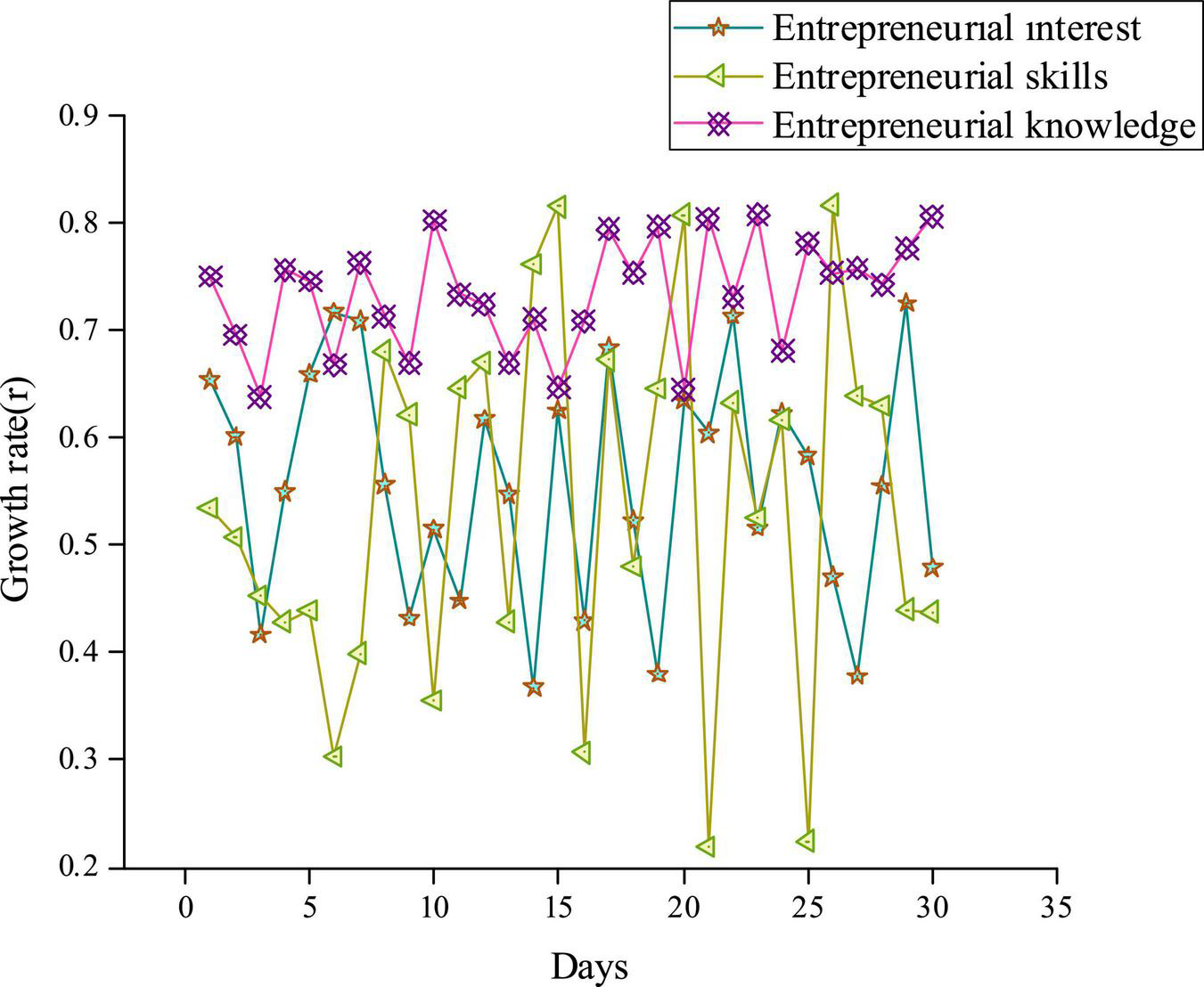 Subsequently, a QS is conducted on 108 Xi’an Conservatory of Music students. The proposed CNN-based CAI model is introduced in college IEE. The growth coefficient is used to study the changes in Music Majors’ entrepreneurial interest, entrepreneurial skills, and entrepreneurial knowledge within 1 month. Figure 7 analyses the results of the Music Majors-oriented IEE’s growth coefficient after introducing the proposed CNN-based CAI.