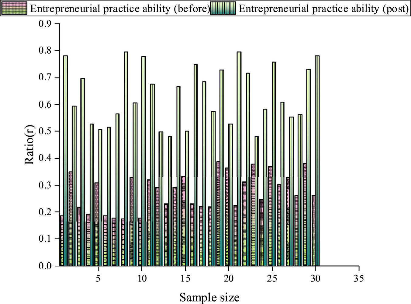 Figure 8 shows that Music Majors’ average score of practical entrepreneurial ability (pre-test) is 0.28 and 0.60 after introducing the proposed CAI model. Moreover, students have individual differences in each dimension after introducing the proposed CAI model. Such individual differences help confirm the research results’ reasonability. Specifically, students’ entrepreneurial practical ability has been improved by more than 50.00%. Thus, the proposed Music Majors-oriented IEE-infiltrated CAI model improves students’ entrepreneurial practical ability and reflects the positive effect of college IEE.