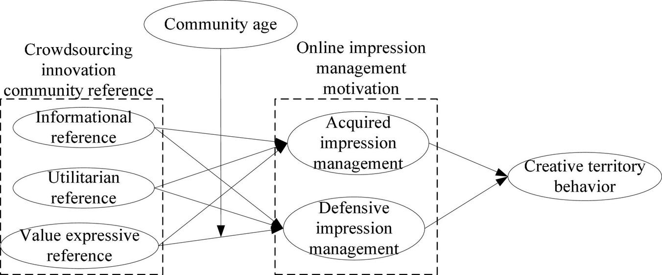 Theoretical model of the relationship between crowdsourcing innovation community reference and creative territory behavior.