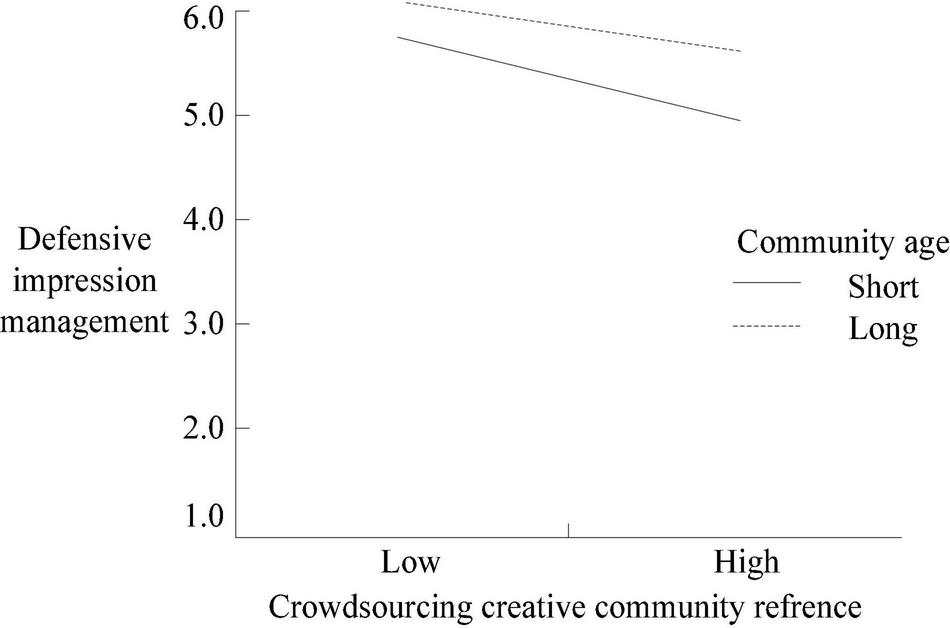 For elder members, first, may have gained a certain community reputation and formed a relatively fixed community impression, so it is difficult for them to improve an individual image through general innovative participation behavior (Bolino et al., 2015). Second, there may be job burnout, which is increasingly tired, sleepy, and even tired of community innovation contribution. Third, they may have exhausted their talents, and the difficulty of innovation is relatively high. For newcomers, the positive images such as community reputation and community status are blank, and they have expectations for the future. Second, new members usually bring new heterogeneous resources such as knowledge, thinking, and values (Brown et al., 2014). Finally, just as the so-called “newborn calves are not afraid of tigers,” the enthusiasm and vitality of new members is a contribution to innovation performance. It can be seen that the longer the community age of the crowdsourcing members are, the more cautious and negative they will be about participating in crowdsourcing innovation. The shorter the community age of the members, the more positive they will be to participate in crowdsourcing innovation.
