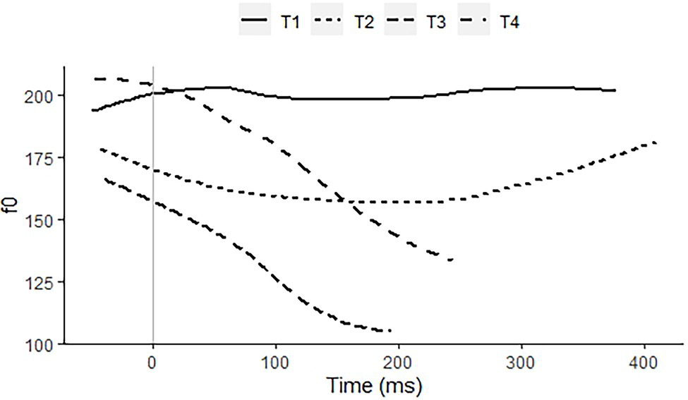 Figure 3. f0 contours of citation pronunciations of a late rise/Tone 1 on 麥 “cereal,” a late fall/Tone 2 on 埋 “bury,” an early rise/Tone 3 on 買 “buy,” and an early fall/Tone 4 on 賣 “sell,” all with the segmental syllable /mae/, recorded by a 22-year-old female speaker of Zhumadian Mandarin.