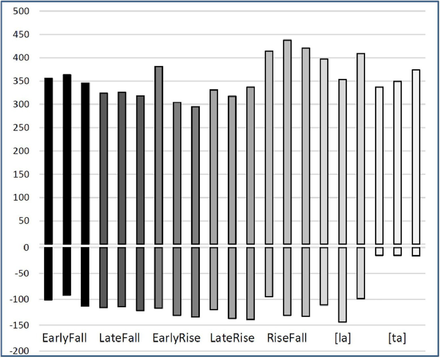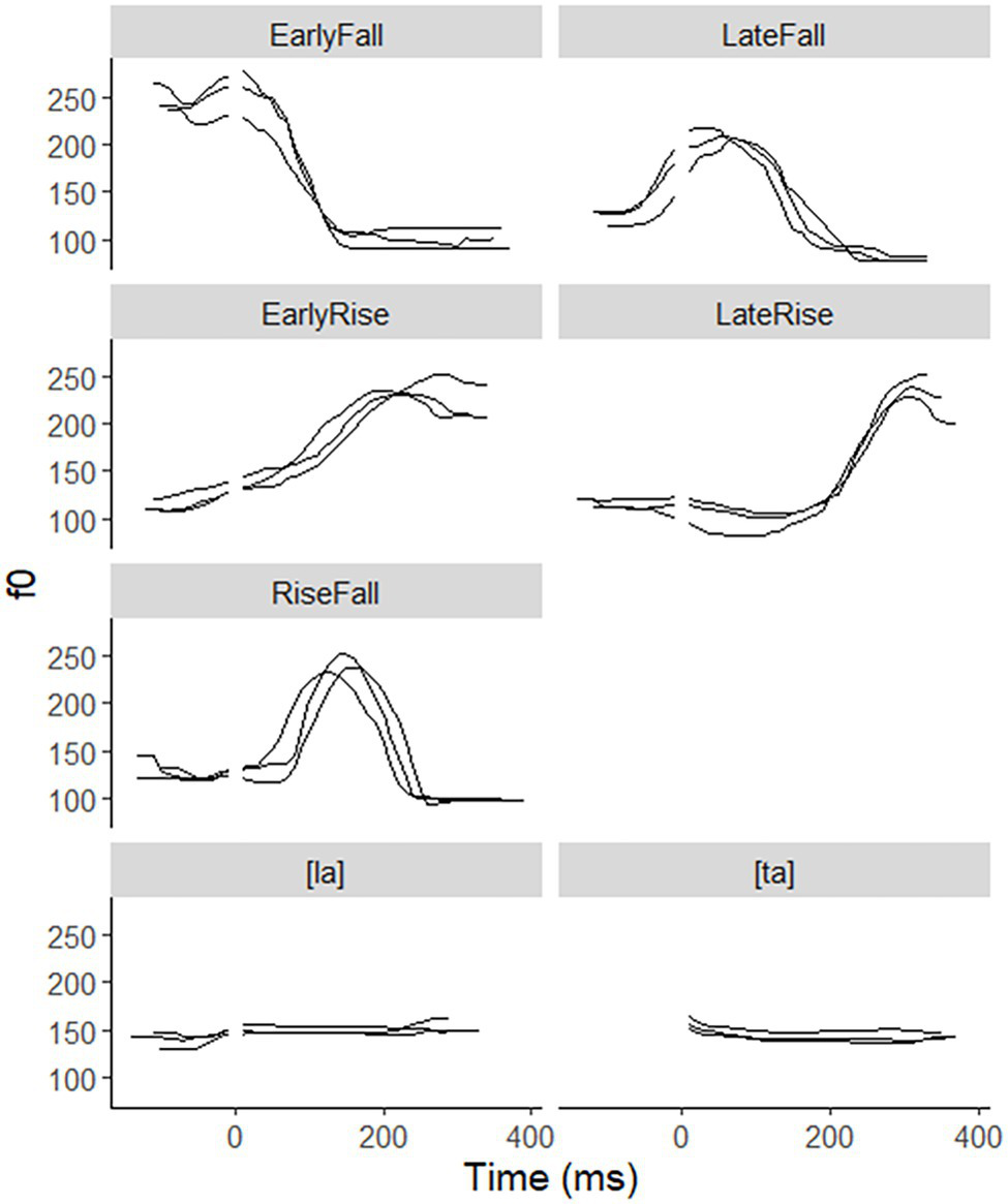 We included three-pitch contrasts in the experiment, EarlyFall vs. LateFall, EarlyRise vs. LateFall, and RiseFall vs. EarlyRise. None of these are pitch levels, which are likely to sound like a melody when occurring in a sequence, which would be more memorable than sequences of pitch shapes. In addition, we used a “phoneme” contrast of the type that has served as a control variable in SRT experiments (Peperkamp et al., 2010; Rahmani et al., 2015; Qin et al., 2017). A phonetically trained speaker of Dutch in his early 70s recorded each of these seven syllable types at least eight times in a sound-treated booth. Three tokens of each syllable type were selected that sounded natural and seemed good exemplars of the intended pitch shape. Figure 5 displays these tokens for all five-pitch shapes figuring in these contrasts, all pronounced on the syllable [la], aligned at the onset-vowel boundary indicated by the gap in the figure, which corresponds to 0 ms in the signal. The phoneme contrast was between the syllables [ta] and [la], both pronounced with level midpitch. We avoided adjustments of the original durations, unlike Peperkamp et al. (2010), who drastically shortened the original recordings of disyllables. Largely depending on pitch shape, tones require a certain duration to produce (Xu and Sun, 2002) and shortened syllables may as a result sound distorted. Across pitch shape types, durations varied from 430 ms for a token of the EarlyRise to 569 ms for a token of the RiseFall. The three tokens had very similar durations in three of the five-pitch shape types. Only the triplets for the EarlyFall and the LateFall varied more noticeably, for which reason we standardized the three exemplars to the rounded mean duration in each triplet, 440 ms and 460 ms, respectively, using Praat (Boersma and Weenink, 1992–2020). Figure 6 shows acoustic durations of all 15 pitch shape stimuli and the 6 stimuli for the phoneme contrast, for onset consonant and vowel separately; in the case of [ta], the burst duration is shown.