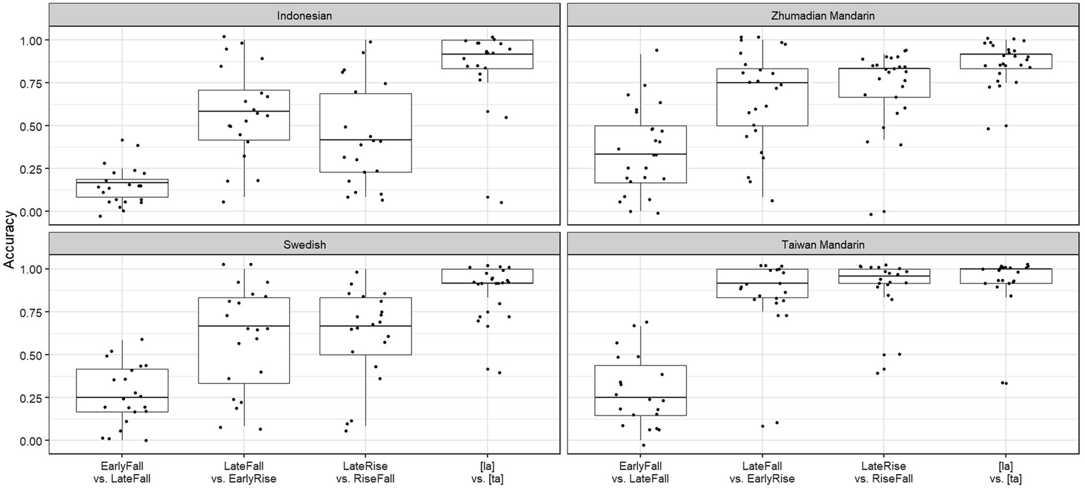 Finally, in order to be able to assess the extent to which the presence of a contrast in the participant’s native language influences accuracy scores, we coded languages for HAVECONTRAST for each pitch contrast. When a language has a contrast in its lexical or postlexical phonology, it is coded 1 for that contrast, otherwise −1. For instance, Zhumadian Mandarin has a lexical contrast between an early aligning and a late-aligning fall, while the other three languages do not, entitling it to a 1 coding for that contrast (see Table 2). It also has a contrast between a late fall and an early rise, corresponding to our second experimental contrast. Taiwan Mandarin has a contrast between a fall and a late rise. Native speaker reactions suggest that the EarlyFall and the LateFall are equally good exemplars of the Taiwan Mandarin Fall, while the EarlyRise and the LateRise are both good exemplars of the Taiwan Mandarin Rise. We therefore also coded both Zhumadian and Taiwan Mandarin as 1 for the LateFall vs. EarlyRise contrast. Indonesian has an intonational contrast between a LateRise and a RiseFall, while the other three languages do not. Swedish lacks monosyllabic contrasts, so that it is harder to define the occurrence of our experimental contrast in the phonology of Swedish. Even if we were to interpret the f0 shapes of the first syllables as a RiseFall for Accent 1 and an EarlyFall for Accent 2 (see Figure 2), this would not correspond to any of the experimental pitch contrasts. Accordingly, all three contrasts are coded as −1 for Swedish.