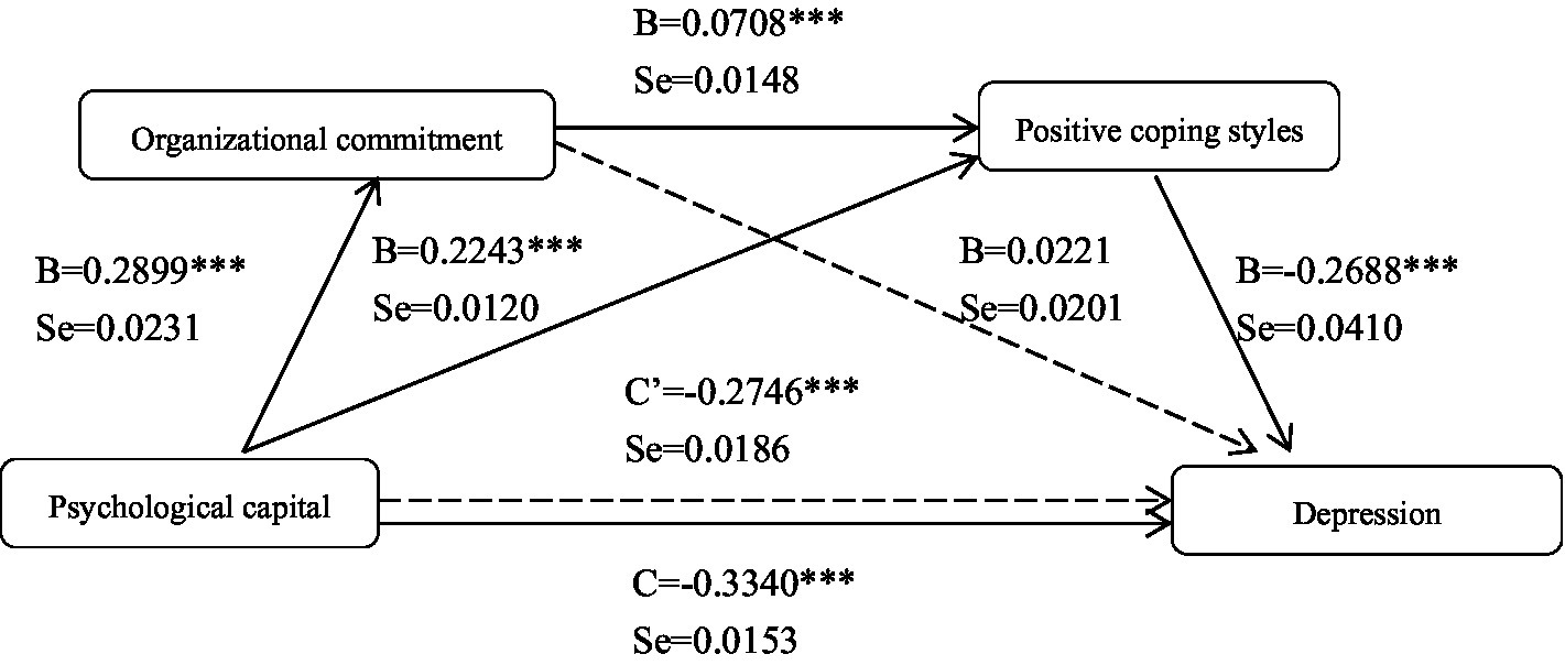 As shown in Table 3, the mediating effect of positive coping styles in the relationship between psychological capital and depression was significant (95% CI: −0.0815, −0.0400). The serial-multiple of organizational commitment and positive coping styles in the relationship between psychological capital and depression was significant (95% CI: −0.0093, −0.0026). The direct effect of psychological capital on depression was significant with a 95% confidence interval (−0.3110, −0.2382).