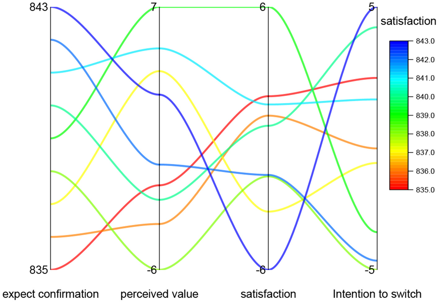 The two-dimensional relationship diagram of IF-THEN model data inference shows that there is a great similarity in the trends of the same clusters of cell phone brand expectation confirmation, perception factors, contributing factors, and satisfaction, while there are great differences in cell phone brand switching intention, so the model data can be clustered. From a statistical point of view, cluster analysis is a method to simplify data categorization through data modeling. The clustering results for cell phone brand switching intention are shown in Figure 4. According to the model 1 of the direct effect of customer experience value on customer commitment, it is verified that customer experience value has a direct and significant positive effect on customer commitment, which satisfies the first condition of the mediating effect. The second condition of the mediating effect is satisfied. according to the partial mediating effect model 3 of customer satisfaction, it is verified that customer experience value has a significant positive influence on customer satisfaction and customer satisfaction has a significant positive influence on customer commitment, but the path coefficient of the influence of customer experience value on customer commitment is 0.373, which is smaller than the path coefficient of the direct influence of customer experience value on customer commitment, which is 0.841, indicating that the relationship between customer satisfaction in customer. This indicates that customer satisfaction plays a part of mediating effect in the relationship between customer experience value and customer commitment. Therefore, hypothesis H6 is accepted.