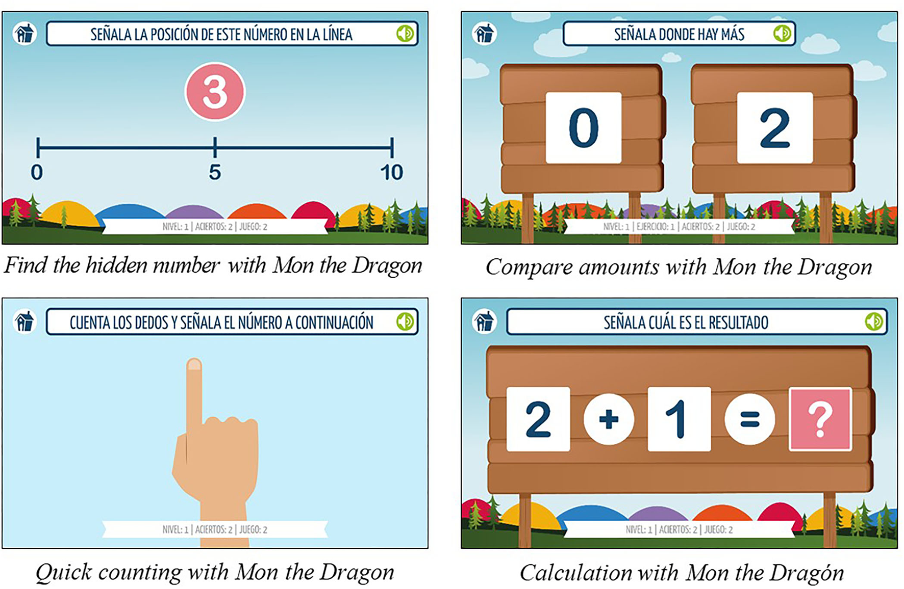 The intervention programme used consisted of 4 apps. These apps for use on touchscreen devices focus on stimulating and training the cognitive foundations associated with early mathematics learning through a simple game in which the participant only has to press a finger on the screen to answer (Mera et al., 2019) (Figure 1). Tablet devices are mobile, lightweight, and do not rely on the motor skills needed to use other technologies, such as a computer keyboard and mouse (Kucirkova et al., 2014).