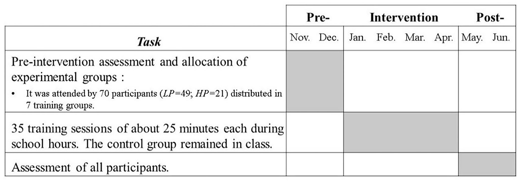 Each student was provided with a tablet to develop the intervention sessions. After the intervention period, in the post-intervention evaluation, the evaluators were maintained in order to try to minimise any extraneous variables that might appear due to the effect of the evaluator, leaving a minimum time margin of 6 months between the two evaluation periods, so that recall would not influence the results of the tests.