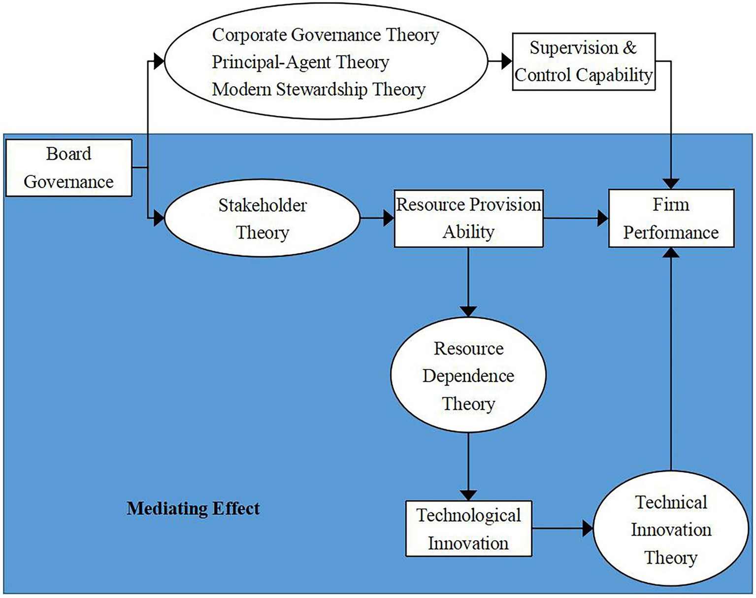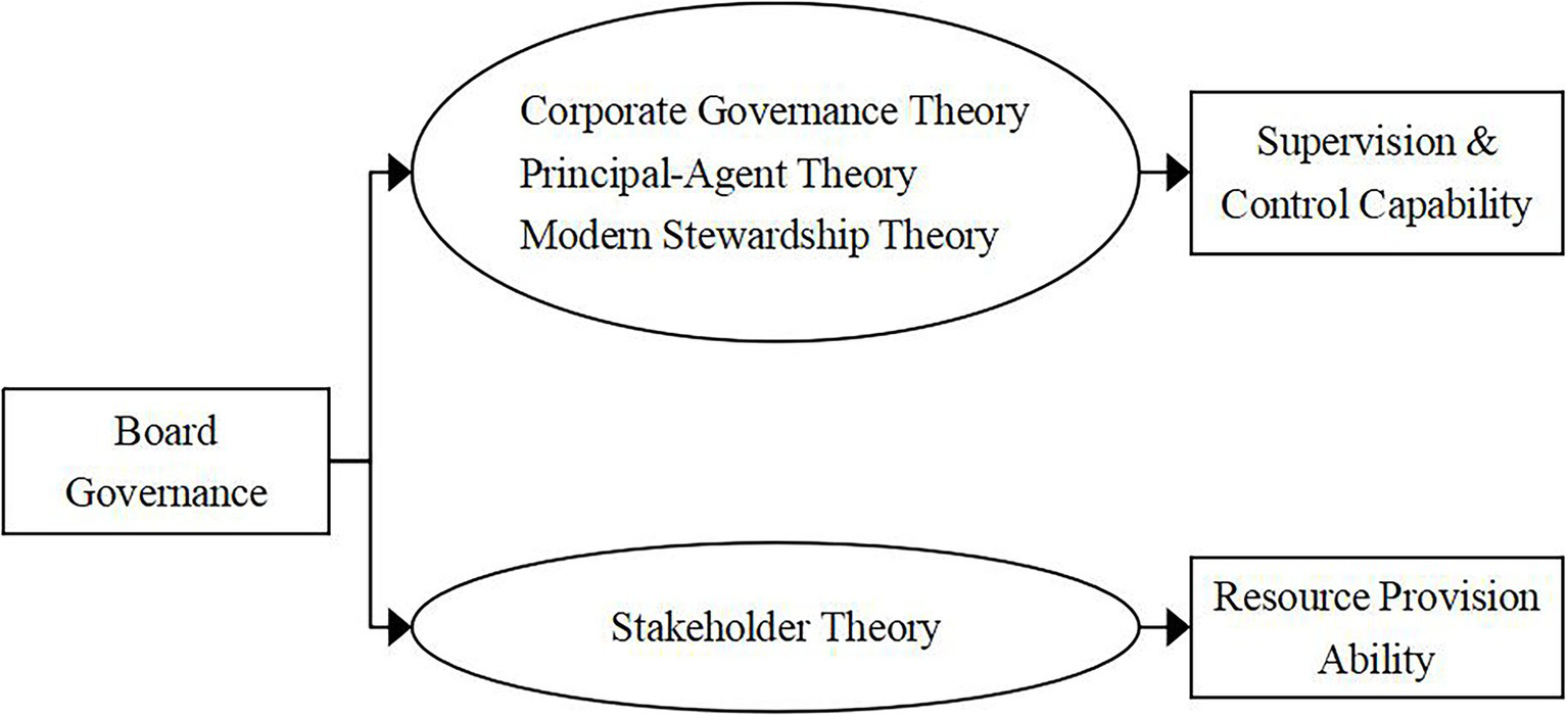 Since the 1980s, the study of board governance has become a hot spot in the field of corporate governance research. With the continuous establishment and improvement of relevant theoretical systems and the continuous maturity of corporate governance-related research, results of research on the structure and characteristics of the board of directors were gradually produced. Zahra and Pearce (1989) established an overall theoretical framework for board governance for the first time. Later scholars continued to revise and improve it on this basis, and gradually formed the theoretical basis of the current board governance. After reviewing a large number of relevant literatures, Di (2018) pointed out that the basic theories of board governance mainly include corporate governance theory, principal-agent theory, modern stewardship theory and stakeholder theory. Among them, the first three theories mainly focused on the board’s ability to supervise and control the company, and discussed how the board of directors plays a role in the company. The stakeholder theory extended board governance to the outside of the company, focusing on the analysis of the resources provided by directors and stakeholders to the company. This theory held that companies built ties with the government by paying taxes in accordance with the law and seeking policy support, and at the same time, they had social responsibilities for the development of their communities and local regions. Therefore, shareholders cannot be regarded as the sole owner of the company, and the interests of internal and external stakeholders should also be considered (Kaler, 2006). At the same time, in the process of maximizing firm performance, the joint participation of internal and external stakeholders was required (Freeman et al., 2020). Companies should enhance the broad participation of the board of directors, attract non-shareholders such as employees, creditors and community representatives, and ensure their voice and voting rights (Polat, 2021). The theoretical support of the stakeholder theory for this paper was to promote more stakeholders into the board of directors, thereby increasing the diversity of the board. At the same time, the board of directors must fully consider the protection of major stakeholders when making decisions, especially those with high risks such as technological innovation. As the company’s decision-making level, even if the board of directors did not participate in the implementation of specific company strategic plans, it should strengthen the guidance of the company’s operating direction when making relevant decisions. Boards should also consider the influence of stakeholders on the formulation and implementation of decisions in order to gain their support when the leverage level was high or when creditors were strong in bargaining power (van Zyl and Mans-Kemp, 2021). Based on the above, we have extracted the relevant theoretical framework of board governance and analyzed the role of board governance as shown in Figure 1.