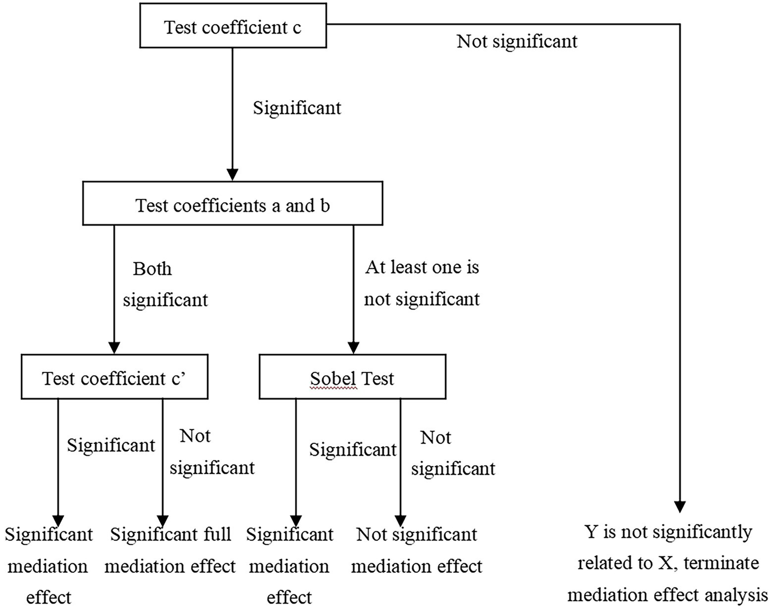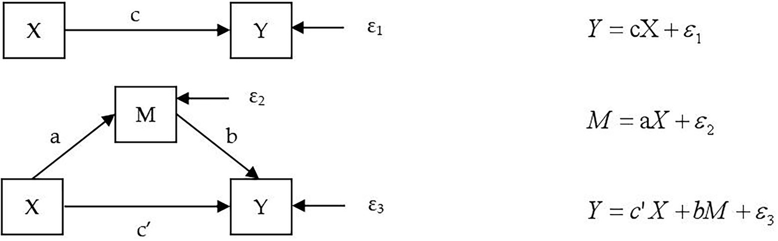 Although the existing measurement software has been able to directly deal with the mediating effect, it is difficult to intuitively reflect the identification process of each stage of the mediating effect. Referring to the mediating effect test method in the field of psychology, this paper adopted the most widely recognized causal step method, that is, the mediating effect was tested in three steps, as shown in Figure 3. This method has been recognized and widely used by a large number of psychologists (Coman et al., 2017; Fairchild et al., 2019; Liu et al., 2021). Compared with measurement software, it can better reflect the intermediate process and internal mechanism of mediating effect, highlighting causal links (Intasao and Hao, 2018; Zhao et al., 2020). The explanatory variable in this paper is board diversity (X), the mediating variable is technological innovation (M), and the explanatory variable is firm performance (Y).