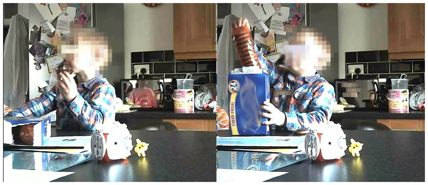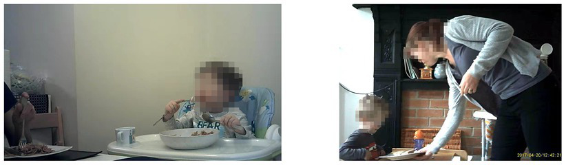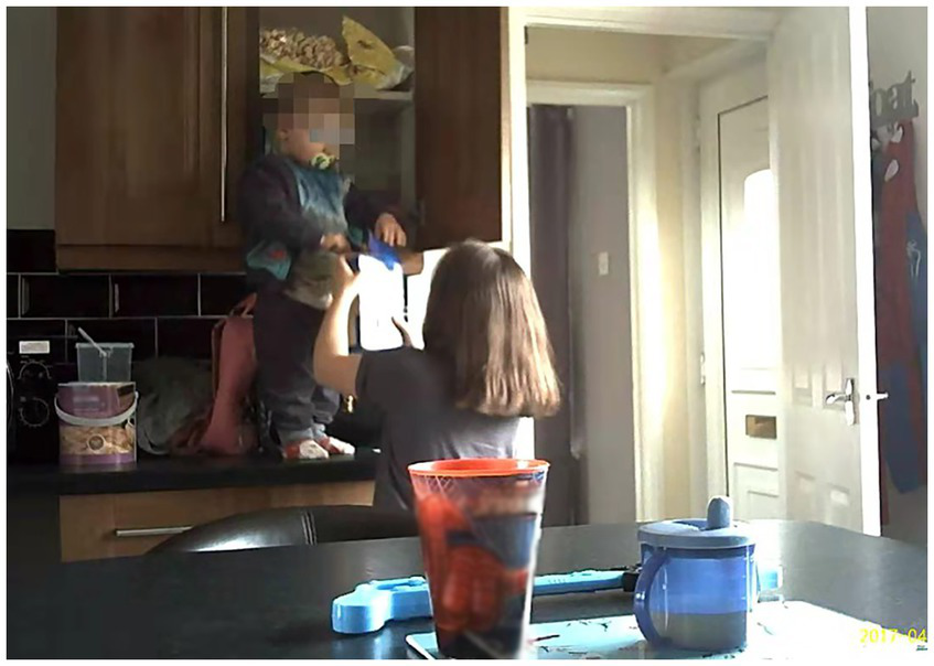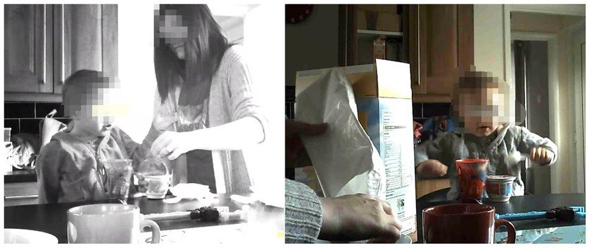 To aid unobtrusive video recording, two compact size cameras with a motion sensor (Conbrov® DV9 HD Book Camera) were set up in participants’ kitchen and dining room for the household observation. This usually started between 5 and 6 pm with the recording until 9 and 10 am following day, depending on usual eating times. The cameras were placed strategically to get the best view to capture what and how the child(ren) ate for breakfast and dinner, then a Go-Pro camera was used to film a snack time. As the cameras were small, there were easily positioned and inconspicuous.
