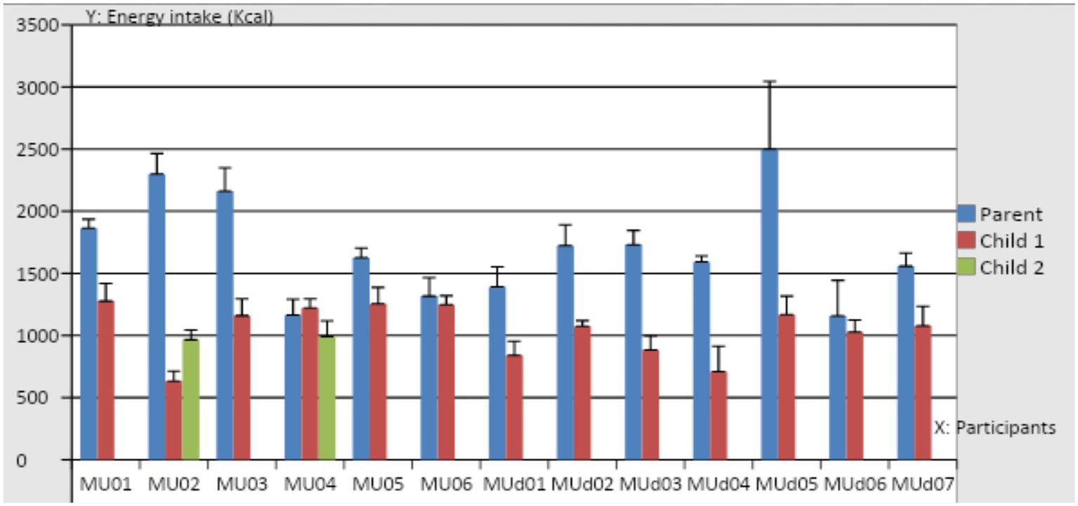 The family’s sociodemographic characteristics (i.e., age, sex, and race/ethnicity) were summarized using descriptive statistics, including frequency (percentage) for categorical variables. Snacks were defined as foods or drinks eaten between main meals (see Chaplin and Smith, 2011). Each food/beverage item was entered from the diaries into an excel sheet by a trained research dietician (FC) then calculated weights and energy (kcal) intake from the weights given in the diary for each item using nutritional composition software WinDiets®. The WinDiets® software comprises two food databases, namely UK Food Tables 2017 and USA Food Tables 2017. One-sample t-tests were carried out using SPSS (IBM SPSS Statistics v20, Armonk, NY, United States) to examine differences in the average energy intake per day between the diary from our participants and the British Nutrition Foundation (2016) energy requirements in the UK. The mean (± standard deviations) for the weight (g) and energy intake (kcal) for snacks and total daily food intakes were calculated. This was done to compare amounts eaten by children to recommended portion sizes (where given). Outcome measures were: mean daily energy intake (kcal) of the parents and children, percentages of energy intake derived from savoury snacks and sweet snacks (including sweets, chocolates, cakes/biscuits and ice cream with an energy density > 4 kcal/g) and mean frequency of snacks eaten by the child and parent participants. Mean intakes were calculated from fruit, vegetables, snacks, drinks and total (g; snacks, meals and beverages combined). One-sample t-tests were performed to examine differences in CFPQ parental feeding practices against published norms. Alpha was set at p < 0.05.