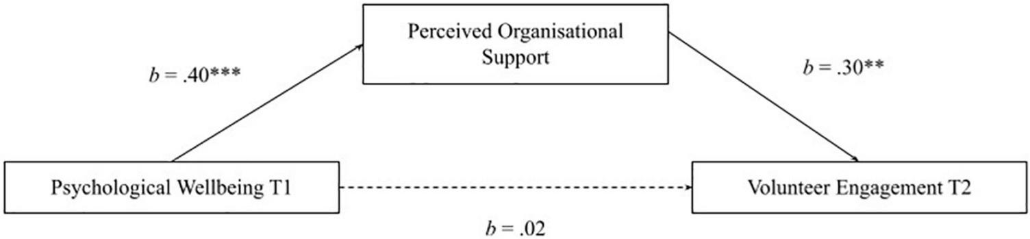 Mediation model of perceived organizational support mediating psychological wellbeing Tl and volunteer engagement T2. Single headed arrows represent regression, unbroken lines represent direct effects, broken lines represent indirect effects.