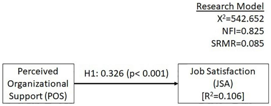 In the light of the above, we aimed to examine the consequences of managers’ work extensification on managers’ experiences of POS on managers’ motivation and JSA. Just as POS has been found to be related to numerous effects on employees and yield positive consequences for organizations, we argue that the same relationship should occur at the management levels. The interest in JSA related to the new ways of working has highlighted the importance of understanding the role of POS, which can help identify the actions that workplaces and HRM need to take to ensure JSA and motivation among all managers. Thus, we focus on examining the effects of managers’ POS on managers’ motivation and JSA. Based on the above, we hypothesized that: