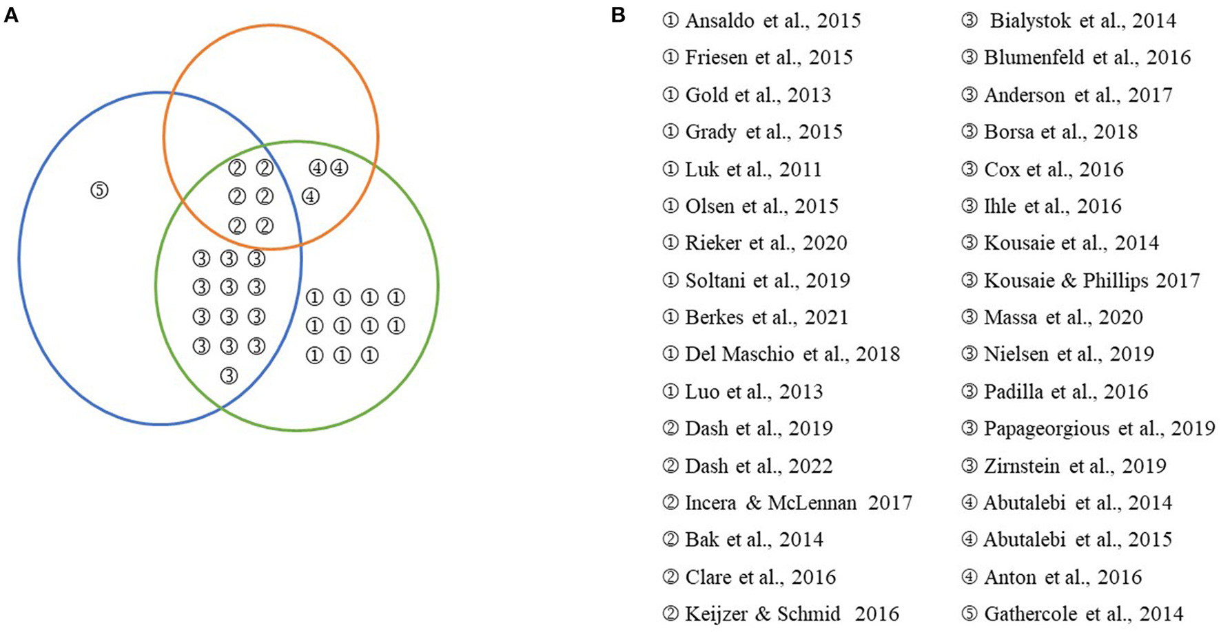 (A) Venn diagram to visually group bilingual research conducted with the aging population within three categories (1) the multifactorial nature of bilingualism (in Orange), (2) the multifactorial nature of cognitive performance (in Blue), and (3) the multifactorial nature of confounding variables (in Green). (B) Numbers refer to the references shown in the corresponding panel.