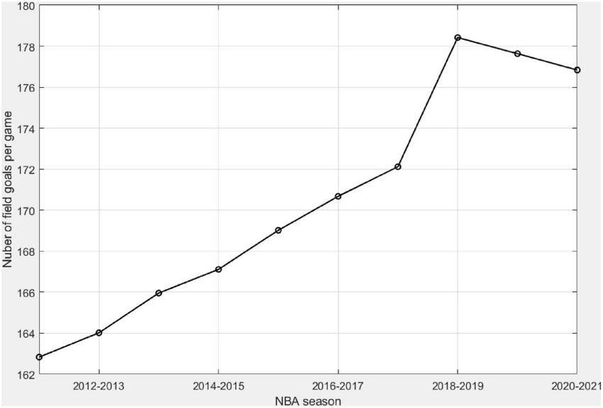 The number of field goals per game has increased from 163 in the 2011–2011 season to 177 in the 2020–2021 season, with a