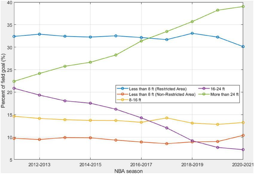 The increase of 3-pointer in the shot distribution is consistent with findings from other studies (Kilcoyne, 2020; Freitas, 2021). The NBA league moved the 3-point line in the 1994–1995 season to enhance scoring across the league. Although the 3-point line was moved back to its original distance after a 3-year experiment, there is a long-lasting influence on shot selection. Many coaches in the league incorporated the three-point field goal into offensive strategies. Professional players with higher accuracy from the long-distance have become more commonplace across the league. Another driving factor contributing to the switch of spot selection between the long-distance and 16–24 ft is that players are primarily encouraged to drive to the basket or shoot a three-pointer (Kilcoyne, 2020). This has resulted in the continuing decline of the mid-range shot with a shooting distance of 16–24 ft since the 2011–12 season. Kilcoyne (2020) also reveals the decline in the mid-range field goals, but the author did not differentiate shooting distances between 8–16 ft and 16–24 ft. Our study finds a slight change in the percentage of field goals within the 8–16 ft. Meanwhile, a steady decline over the past decade has been found in the field goal attempt in the 16–24 ft. Kilcoyne (2020) lumped all 2-point field goals, ignoring the different shooting distances within the 3-point line, in analyzing the percentage of 2-point and 3-point field goals.