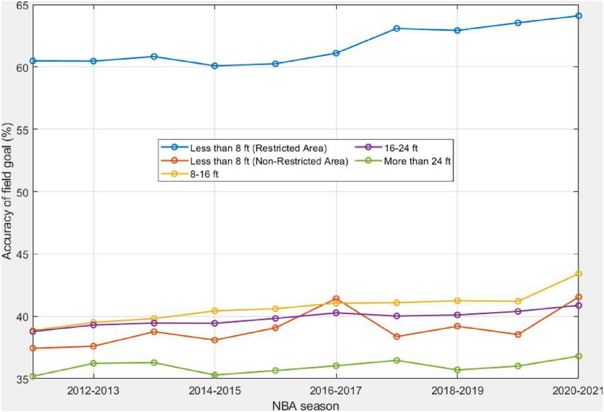 Changes have also been made to NBA basketball games in the past years (Nourayi, 2019). Most rule changes introduced in the NBA aim to keep enhancing the pace, speed, and flow of basketball games. For instance, basketball teams were allowed to have only two, instead of three, time-outs in the final 3 min of the games starting from the 2017–2018 season. Responding to rule changes, Professional players changed shooting style or spot selection in basketball games. Mandić et al. (2019) analyzed the 2000–2017 NBA data and found an increasing pace of basketball games, owing to a series of changes to off-ball fouls, clear-path fouls, and similar changes which aimed to quicken the flow of the game. Kilcoyne (2020) found a decline in the mid-range jump shot, defined as field goals with a shooting distance in the range of 8–24 ft, by analyzing NBA data from the 2005–2006 season through 2018–2019. The defined range between 8 and 24 ft in Kilcoyne (2020) seems not narrow enough to examine if the decline occurred in the shooting distance of 8–16 ft or 16–24 ft. An analysis of a rich dataset is needed to provide insights into whether mid-range accuracy decline occurred in the shooting distance of 8–16 ft or 16–24 ft. In addition, there lacks an examination of field-goal accuracy changes in the restricted area. To fill the gap, this study comprehensively analyzes changes in the shooting style and field goal accuracy in the NBA league.
