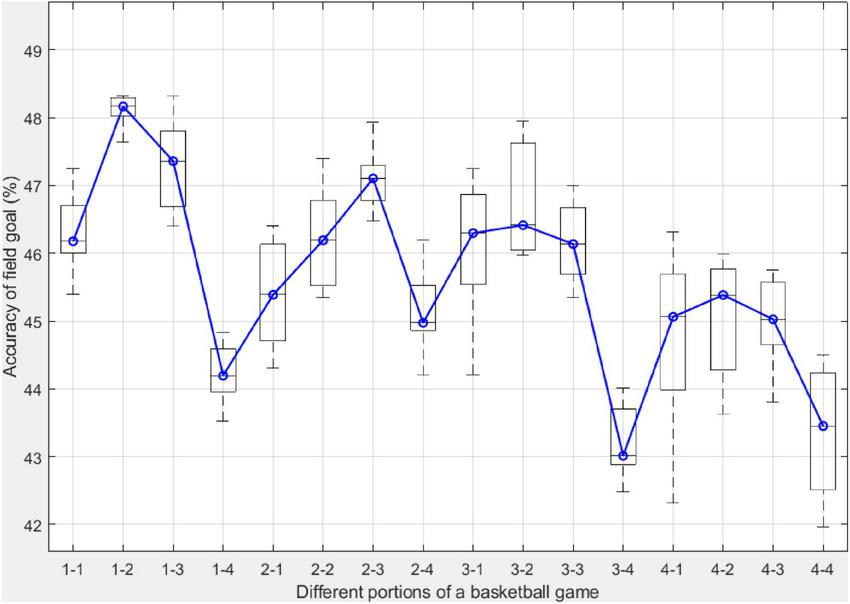 Similarly, Figure 6 shows the accuracy of field goals attempted from different segments of a basketball game. Each boxplot of a segment is comprised of ten values, each representing the accuracy of field goal attempts from the corresponding segment in one NBA regular season. The blue line in Figure 6 connects the median of all boxplots . Overall, field goal accuracy decreases when the basketball game proceeds, evidenced by the p-value of the Mann-Kendall test . In addition, All segments except the fourth segment in the first quarter have higher accuracy than the corresponding segment in the other three quarters.