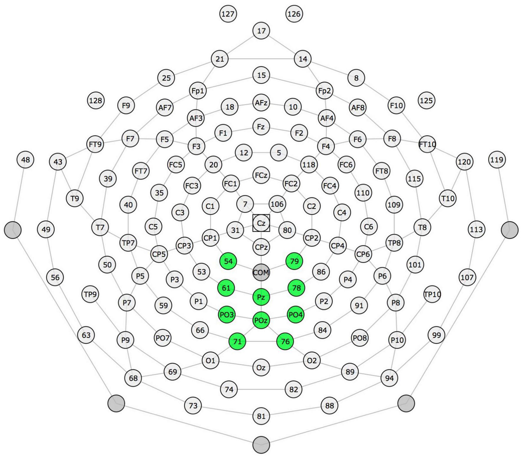 The electrode montage (parietal region) and time windows of interest were modified from previous literature on the P300 response in children (Key et al., 2005; Papagiannopoulou and Lagopoulos, 2017). Based on the topographic plot for the 128 electrodes of the grand average (all the participants averaged together for the English and Spanish experiments separately), the data were visually inspected to determine where in the parietal region the P300 was observed. The P300 was identified visually in a cluster of 10 electrodes in the medial-parietal region (see Figure 1 for electrode montage) for the English contrasts (a P300 effect was not observed anywhere in the region for the Spanish contrasts, either at these or at any other parietal electrodes). Electrodes within this cluster were averaged for subsequent analysis, which was performed using the ERPLAB ERP Measurement Tool (Lopez-Calderon and Luck, 2014). Difference waves were generated by subtracting the mean amplitude of the standard from the deviant stimulus (deviant - standard) at each latency. Mean P300 amplitude was computed by averaging across all latencies in the difference wave from 250 to 500 ms post-stimulus onset. Although positivity for the deviant response extends beyond this timeframe, the difference wave which will be used for statistical analyses appears to “peak” within this time window. (We also report descriptive statistics of mean amplitude for the standard and deviant conditions; those mean amplitudes were computed in the same way). To determine fractional peak latency, the most positive local peak that was positive over three samples (6 ms) was identified, after which the 50% fractional peak latency (the time at which voltage reached 50% of this local peak) was computed (Kiesel et al., 2008). For a small number of participants, this latency measure was non-computable due to difference wave morphology (English contrast: N = 1; Spanish contrast: N = 3); these participants were excluded from latency analyses. These mean amplitude and fractional peak latency of the difference wave were used for regression analyses.