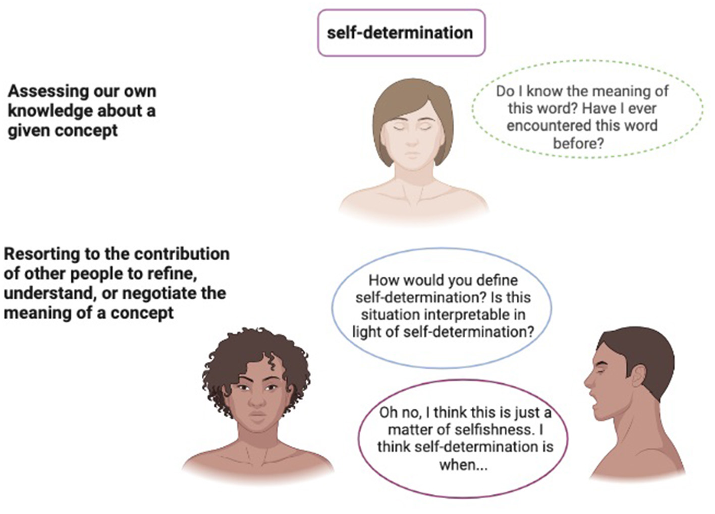 To sum up, the study of abstract concepts might be significant for research on belief because during the use of abstract more than concrete concepts, we form a belief in the reliability and solidity of our knowledge, and because we seek to understand more the beliefs of others in given domains (see Figure 1—An example of the mechanisms described: the abstract concept “Self-determination”).