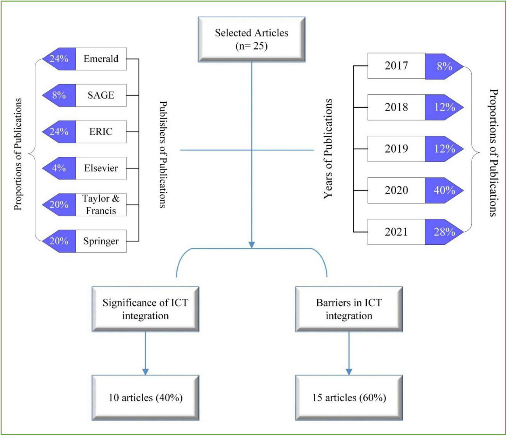 Keeping in view to report the updated literature, the articles from the last 5 years between the time-span of 2017–2021 were selected (Figure 1). In this inquiry, 25 publications were included that were selected by specifying the different types of search terms, such as teachers’ perceptions, beliefs, usage, and attitudes toward ICT integration, and encountered challenges in their application. These key terms were further searched by combining them with terms like school and higher-level to acquire a wide range of information. Furthermore, to investigate the integration of ICT in teaching practices, the terms such as integration, usage, incorporation, and adoption were used to acquire more specific results. All the selected articles were checked manually by checking their abstracts to make sure the articles fell within the scope of the study. The papers out of the scope were excluded based on the publication time, location, and domain, and finally, 25 articles were selected.