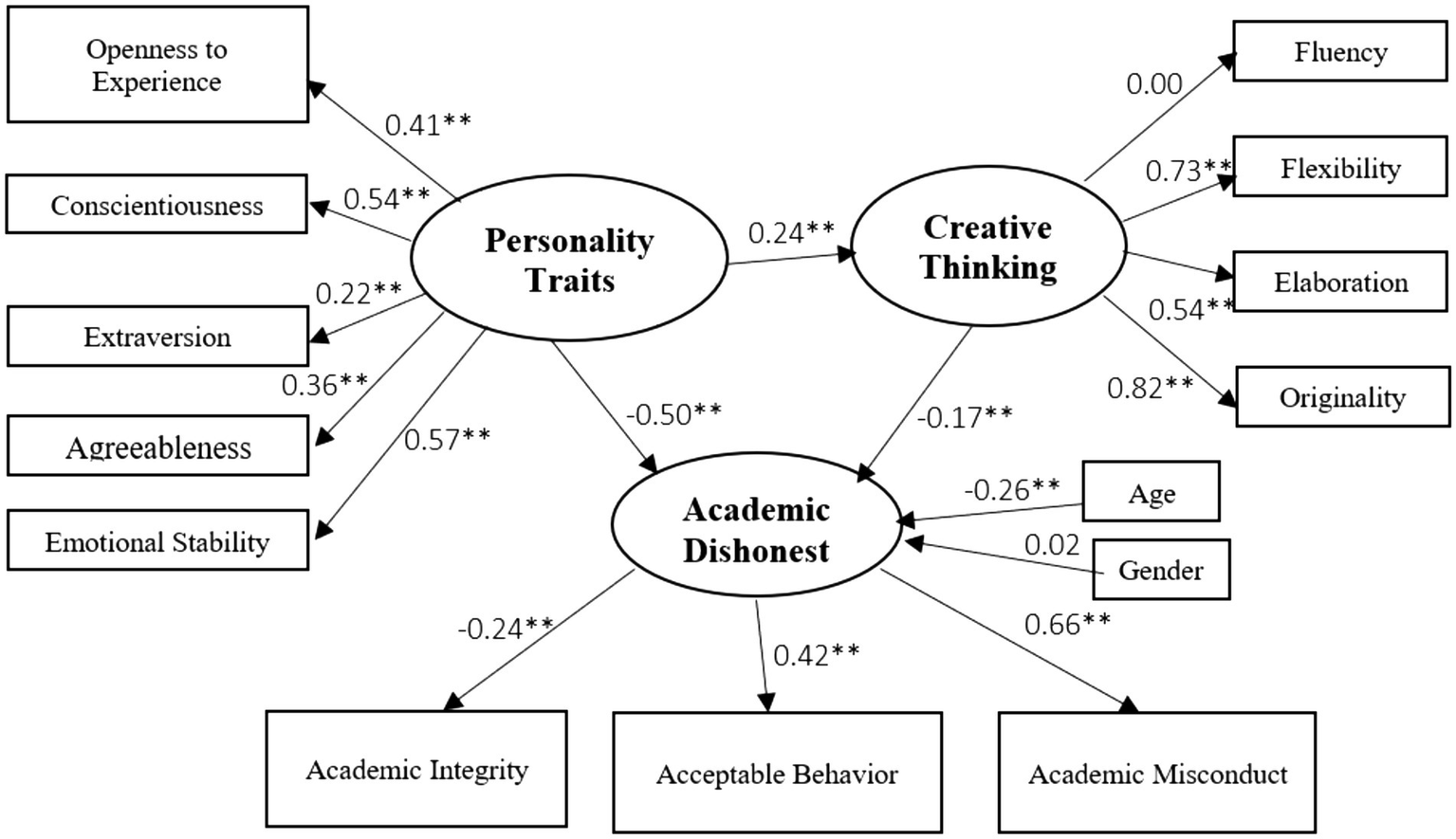 Figure 1. Structural model for creative thinking, personality traits, and academic dishonesty in education students.