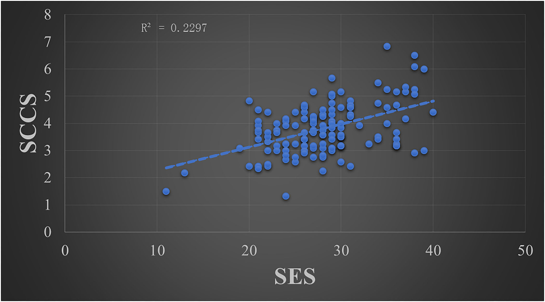 The skewness absolute values were 0.141 for the RSES score and 0.488 for the SCCS score, and the kurtosis absolute values were 0.371 for the RSES score and 0.713 for the SCCS score. According to previous studies (Curran et al., 1996; Xiao and Huang, 2022), the data met a normal distribution due to the skewness absolute values being less than 2 and the kurtosis absolute values being less than 7. Thus, the Pearson Product-Moment Correlation was used to analyze the relationship between the RSES and SCCS scores, where the statistical threshold was two-tailed p < 0.05. The results showed that there was a significant positive correlation between the SES scores and SCCS scores (r = 0.479, p < 0.001, R2 = 0.2297) (see Figure 1).