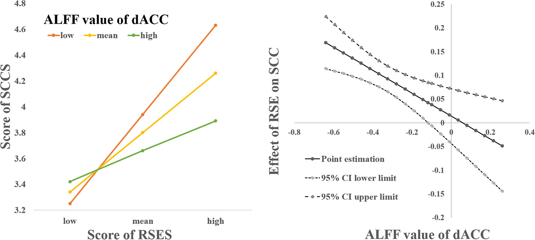 The interaction between the RSES score and the left dACC was not significant when predicting the SCCS score [F(1, 117) = 2.876, p = 0.093, ΔR2 = 0.017]; however, the interaction between the RSES score and the right dACC score was significant when predicting the SCCS score [F(1, 117) = 9.602, p = 0.002, ΔR2 = 0.055]. Simple slope analysis results show that when the ALFF value of the right dACC was lower (mean +1 SD), the RSES score was significantly positively correlated with the SCCS score (β = 0.694, t = 7.334, p < 0.001), while when the ALFF of the right dACC was higher (mean +1 SD), there was a significant correlation between the RSES and SCCS scores (β = 0.256, t = 2.072, p = 0.041). The Johnson-Neyman intervals showed that the RSES score was positively correlated with the SCCS score when the ALFF value of the right dACC was lower than −0.118 (including 86.99% of our sample), but the positive relationships between them were not significant when the ALFF value was greater than this value (see Figure 2).