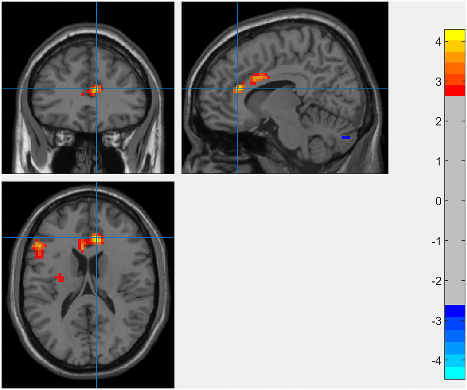 The results of the whole-brain analysis showed that the interaction effect between SCCS and RSES was significant in the right dACC (9, 33, 18) with [−1 1] t-contrast (see Figure 3 and Table 1).